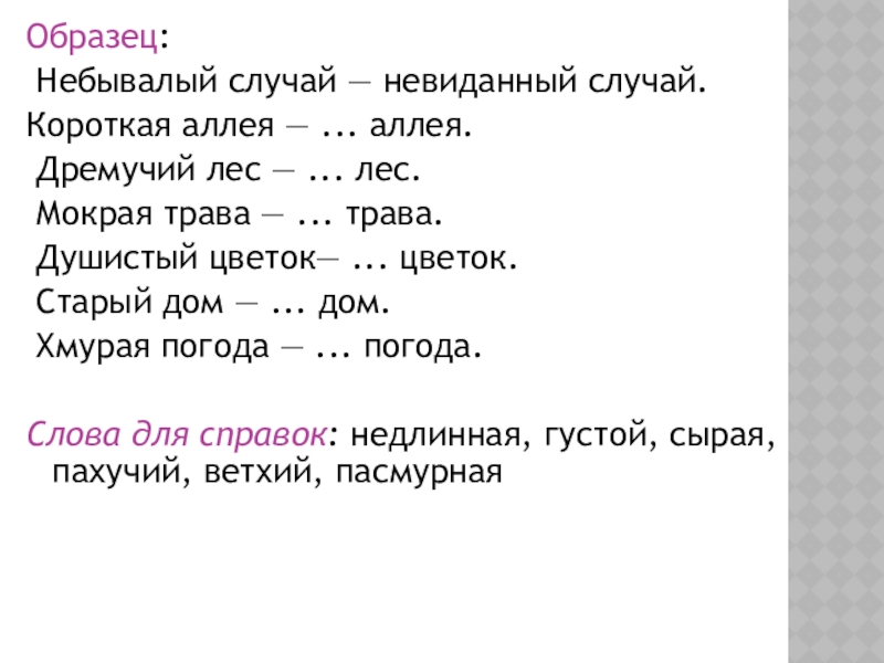 словосочетания из прилагательного и существительного. Опираясь на слова для справок, они должны заменить прилагательные на другие, но такого же лексического значения.