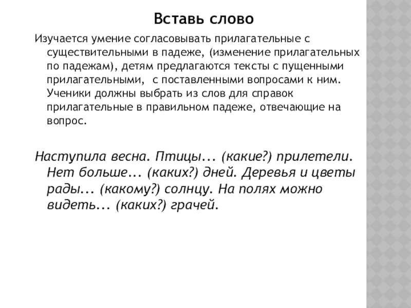 по падежам), детям предлагаются тексты с пущенными прилагательными, с поставленными вопросами к ним. Ученики должны выбрать из слов для справок прилагательные в правильном падеже, отвечающие на вопрос.