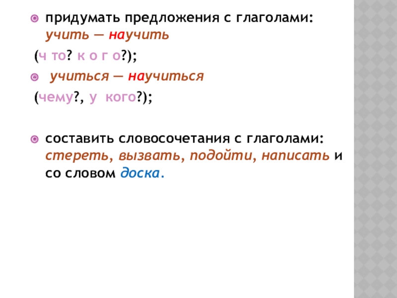 составить словосочетания с глаголами: стереть, вызвать, подойти, написать и со словом доска.
