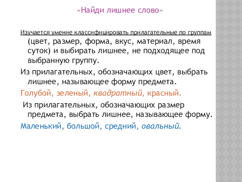 Изучается умение классифицировать прилагательные по группам (цвет, размер, форма,