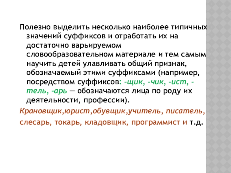 достаточно варьируемом словообразовательном материале и тем самым научить детей улавливать общий признак, обозначаемый этими суффиксами (например, посредством суффиксов: -щик, -чик, -ист, -тель, -арь — обозначаются лица по роду их деятельности, профессии).