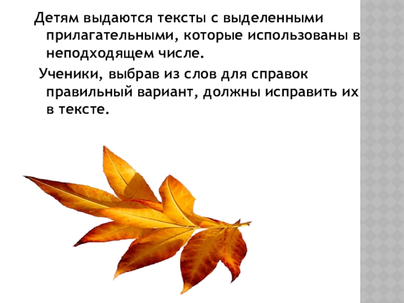 Слайд 30Детям выдаются тексты с выделенными прилагательными, которые использованы в неподходящем числе.