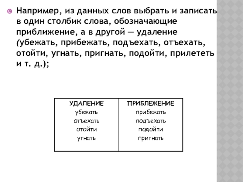 обозначающие приближение, а в другой — удаление (убежать, прибежать, подъехать, отъехать, отойти, угнать, пригнать, подойти, прилететь и т. д.);