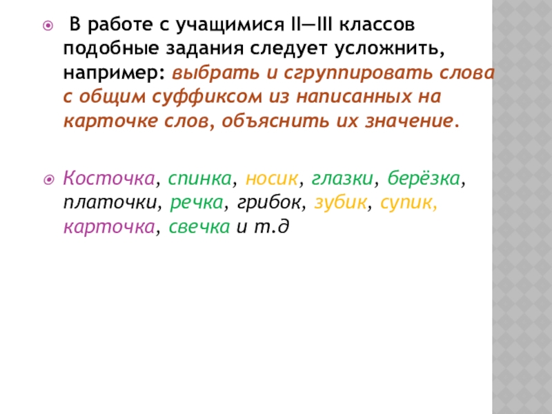 например: выбрать и сгруппировать слова с общим суффиксом из написанных на карточке слов, объяснить их значение.