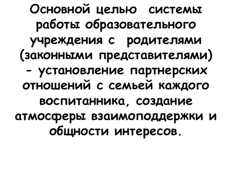 Основной целью  системы работы образовательного учреждения с  родителями (законными представителями) - установление партнерских отношений с семьей каждого воспитанника, создание атмосферы взаимоподдержки и общности интересов.