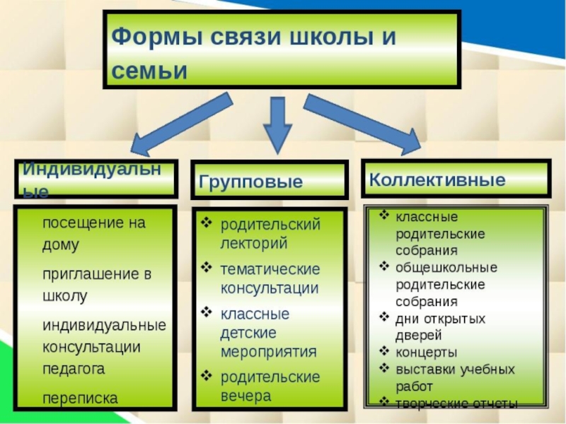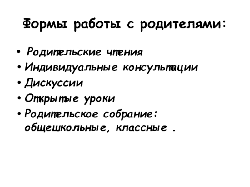 Формы работы с родителями: Родительские чтения Индивидуальные консультации ДискуссииОткрытые уроки Родительское собрание: общешкольные, классные .