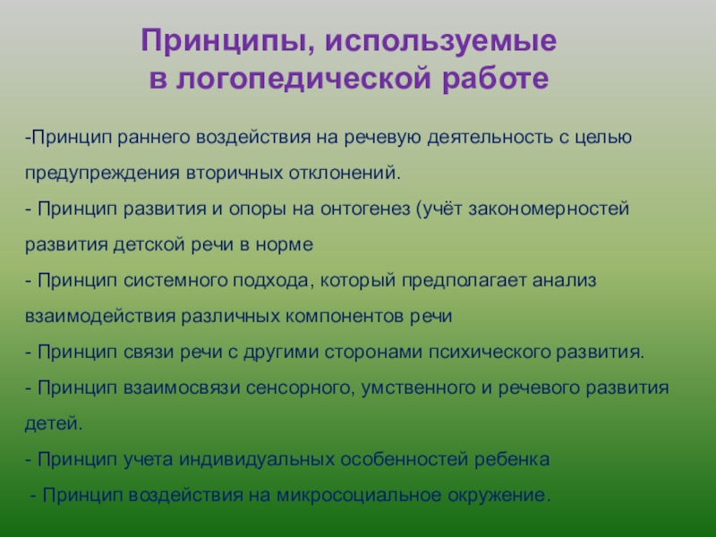 - Принцип развития и опоры на онтогенез (учёт закономерностей развития детской речи в норме