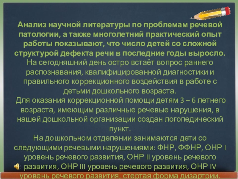 Слайд 4Анализ научной литературы по проблемам речевой патологии, а также многолетний практический