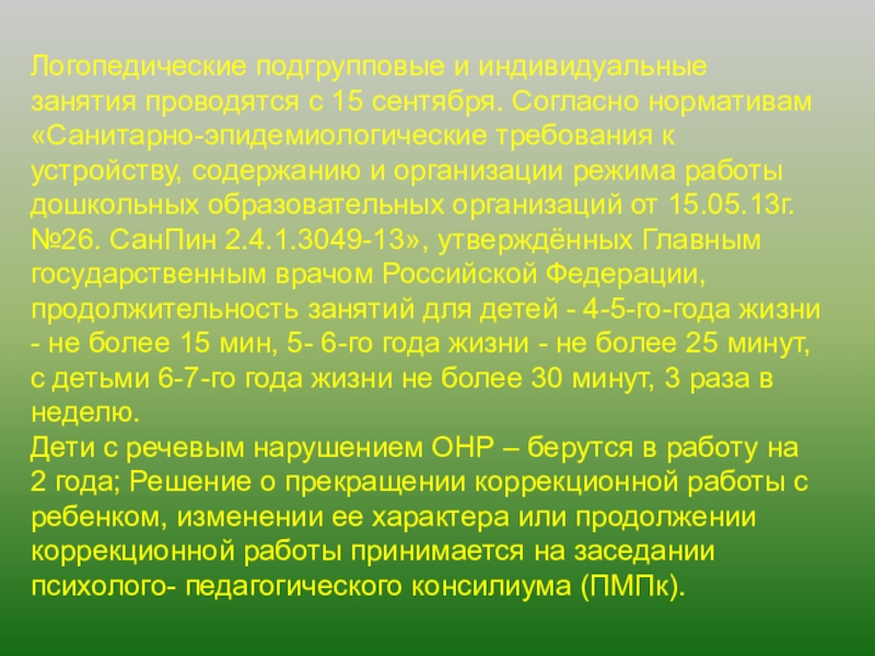 Слайд 12Логопедические подгрупповые и индивидуальные занятия проводятся с 15 сентября. Согласно нормативам