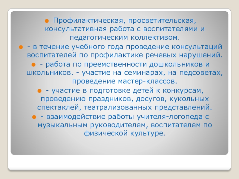 Слайд 8Профилактическая, просветительская, консультативная работа с воспитателями и педагогическим коллективом.