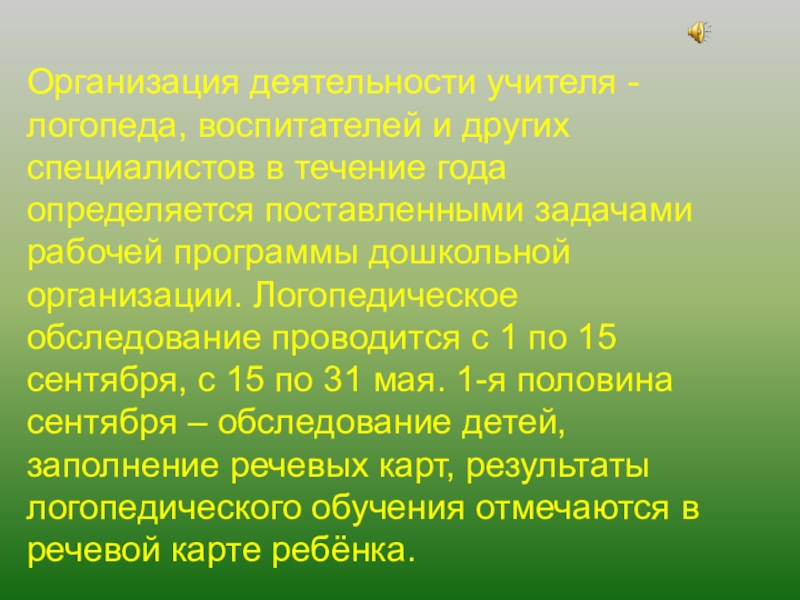 года определяется поставленными задачами рабочей программы дошкольной организации. Логопедическое обследование проводится с 1 по 15 сентября, с 15 по 31 мая. 1-я половина сентября – обследование детей, заполнение речевых карт, результаты логопедического обучения отмечаются в речевой карте ребёнка.
