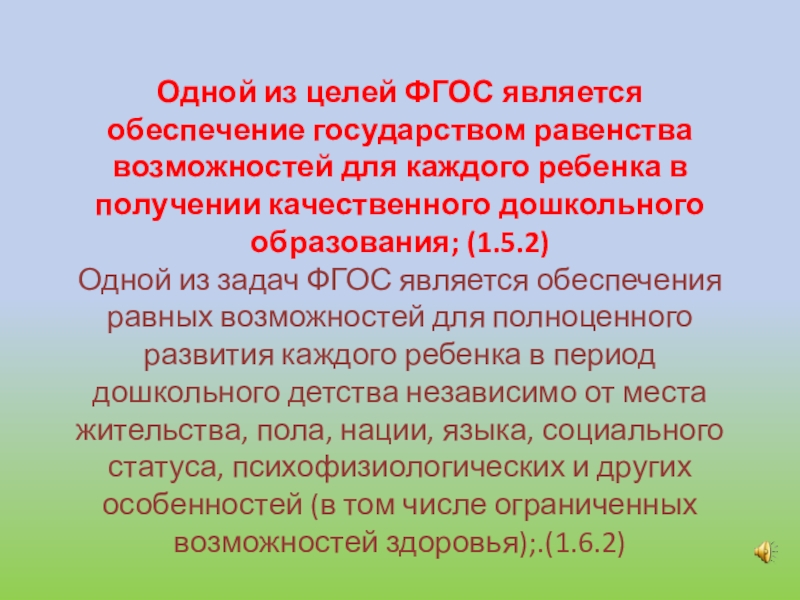 Одной из задач ФГОС является обеспечения равных возможностей для полноценного развития каждого ребенка в период дошкольного детства независимо от места жительства, пола, нации, языка, социального статуса, психофизиологических и других особенностей (в том числе ограниченных возможностей здоровья);.(1.6.2)