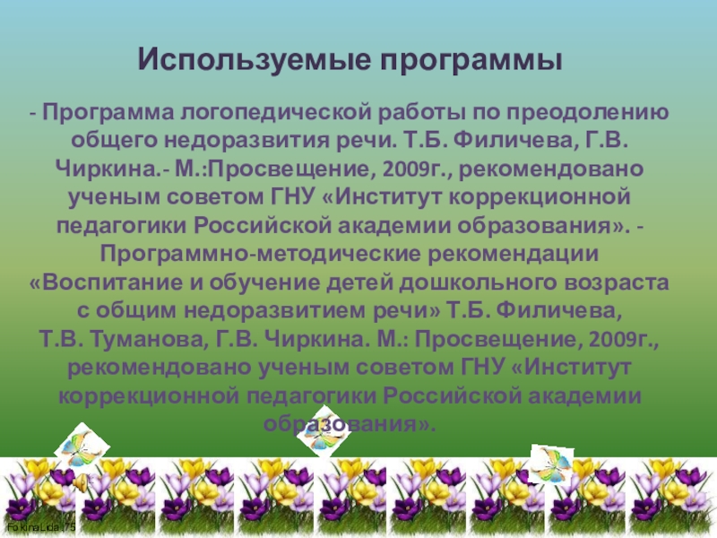 Т.Б. Филичева, Г.В. Чиркина.- М.:Просвещение, 2009г., рекомендовано ученым советом ГНУ «Институт коррекционной педагогики Российской академии образования». - Программно-методические рекомендации «Воспитание и обучение детей дошкольного возраста с общим недоразвитием речи» Т.Б. Филичева,
