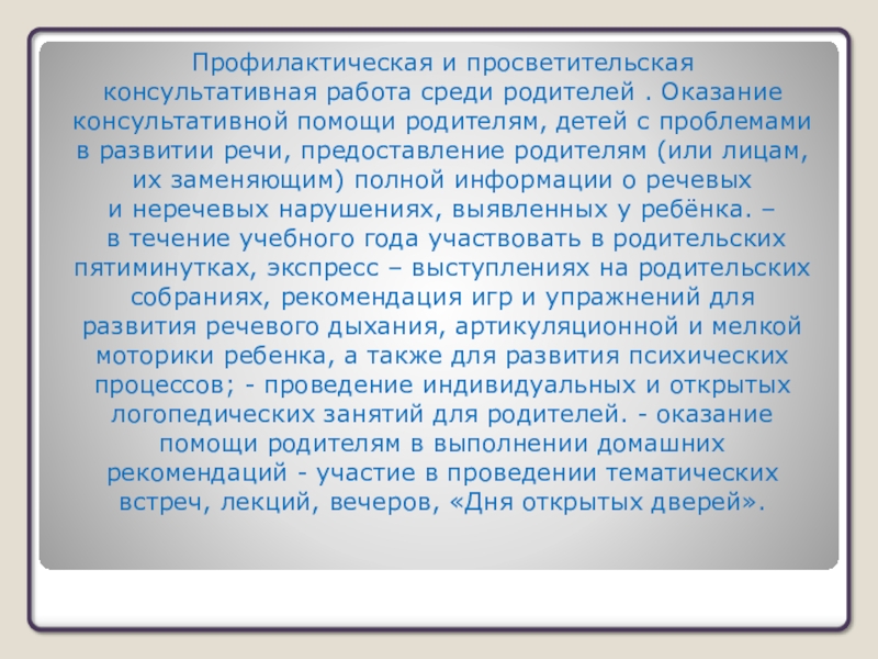 в течение учебного года участвовать в родительских пятиминутках, экспресс – выступлениях на родительских собраниях, рекомендация игр и упражнений для развития речевого дыхания, артикуляционной и мелкой моторики ребенка, а также для развития психических процессов; - проведение индивидуальных и открытых логопедических занятий для родителей. - оказание помощи родителям в выполнении домашних рекомендаций - участие в проведении тематических встреч, лекций, вечеров, «Дня открытых дверей».