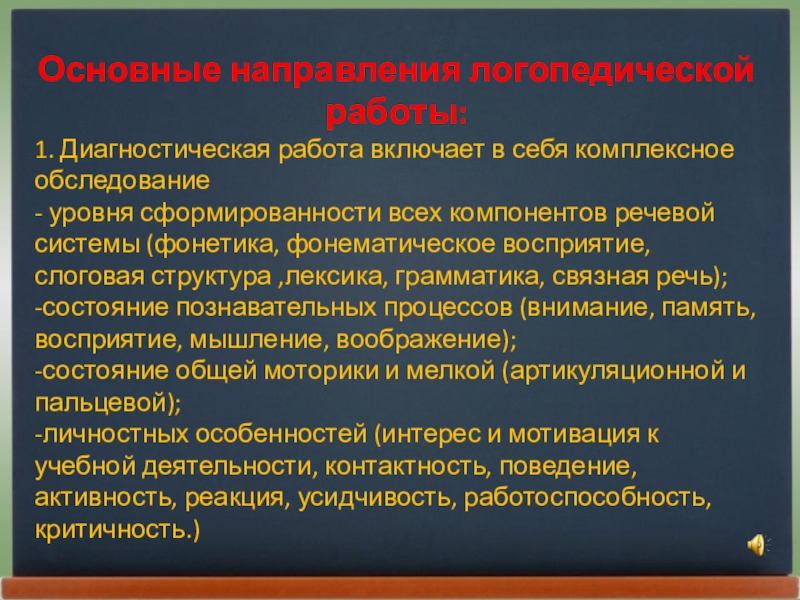 - уровня сформированности всех компонентов речевой системы (фонетика, фонематическое восприятие, слоговая структура ,лексика, грамматика, связная речь);