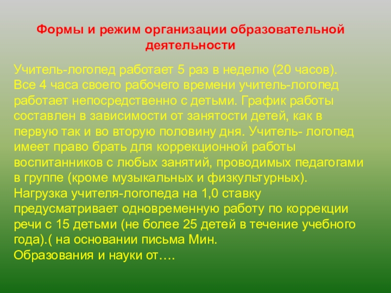 Нагрузка учителя-логопеда на 1,0 ставку предусматривает одновременную работу по коррекции речи с 15 детьми (не более 25 детей в течение учебного года).( на основании письма Мин.