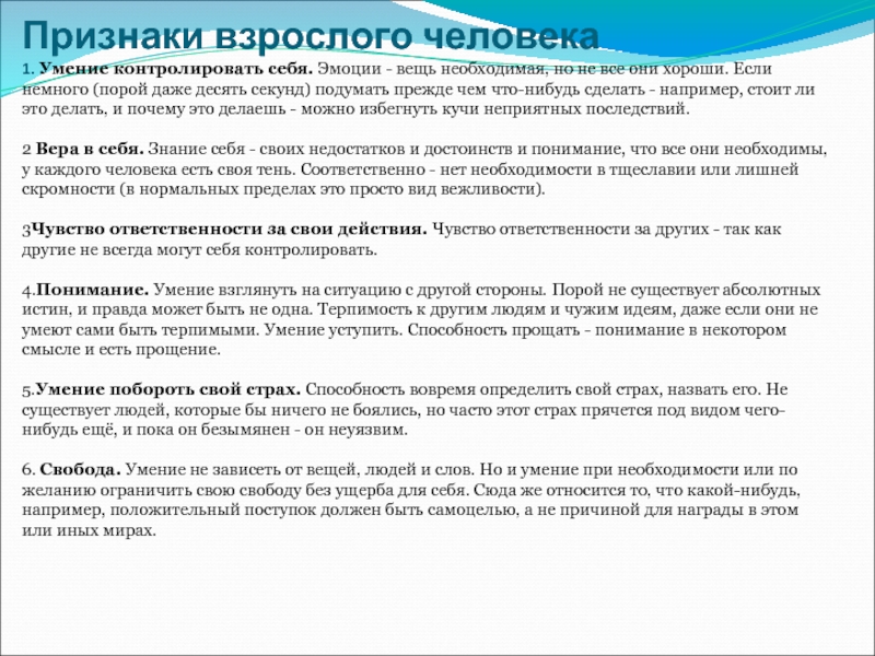 6. Свобода. Умение не зависеть от вещей, людей и слов. Но и умение при необходимости или по желанию ограничить свою свободу без ущерба для себя. Сюда же относится то, что какой-нибудь, например, положительный поступок должен быть самоцелью, а не причиной для награды в этом или иных мирах.