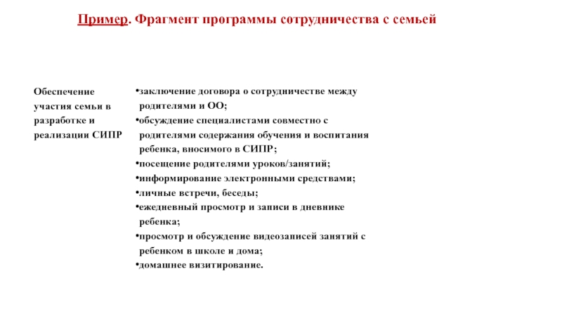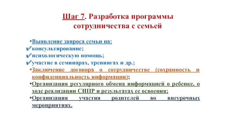 7. Перечень возможных задач, мероприятий и форм сотрудничества организации и семьи обучающегося