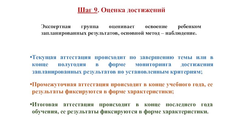 Экспертная группа оценивает освоение ребенком запланированных результатов, основной метод – наблюдение.