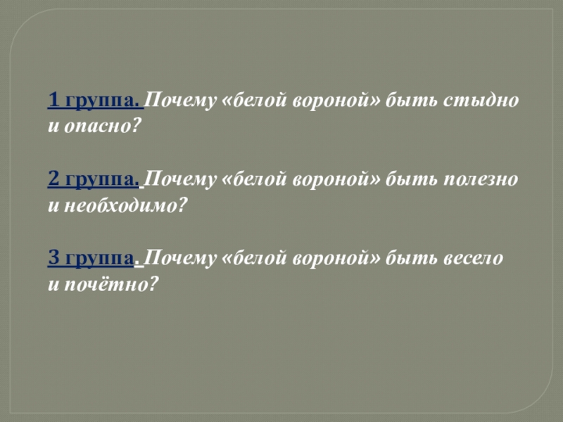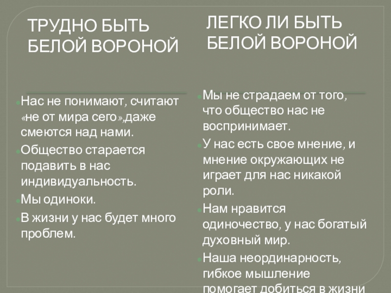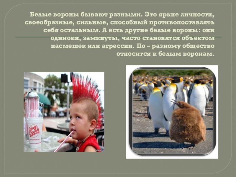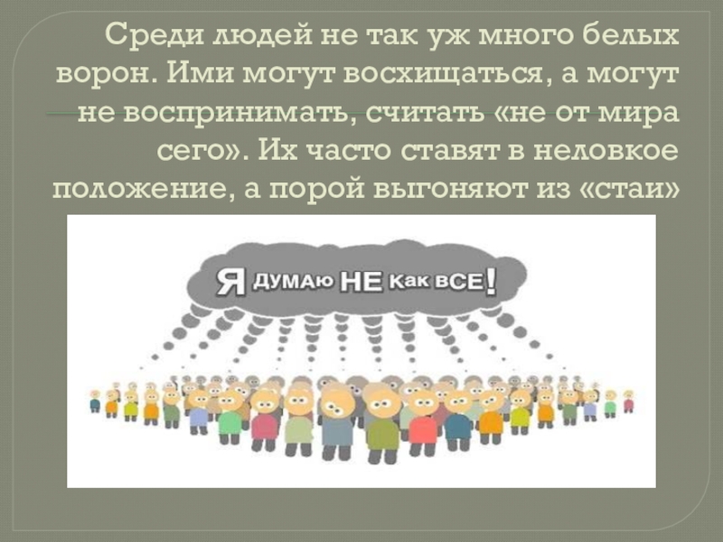 В природе очень редко встречаются животные белого цвета, они называются альбиносами, а само явление – альбинизмом. Альбиносы бывают и среди ворон, но это большая редкость. Сравнение отличного от остальных человека с белой вороной употребляется применительно к человеку, резко выделяющемуся среди окружающих своими особыми качествами.
