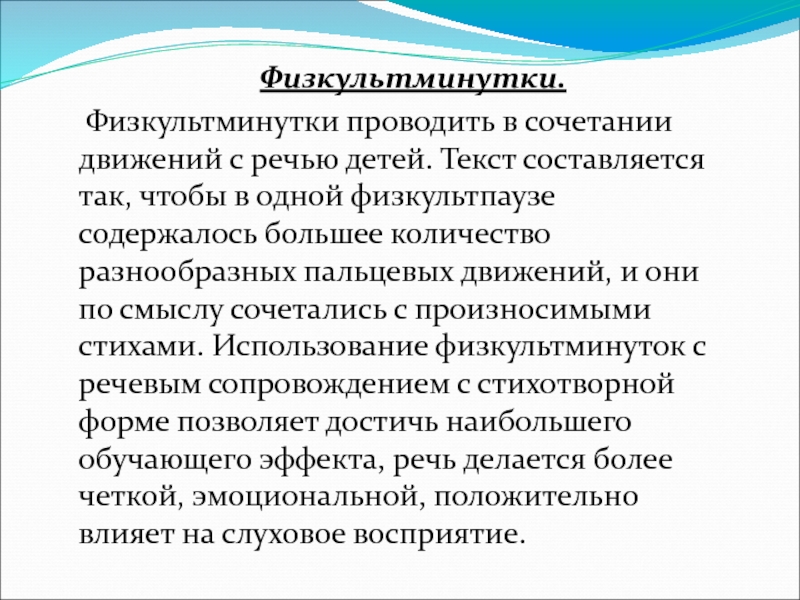 Физкультминутки проводить в сочетании движений с речью детей. Текст составляется так, чтобы в одной физкультпаузе содержалось большее количество разнообразных пальцевых движений, и они по смыслу сочетались с произносимыми стихами. Использование физкультминуток с речевым сопровождением с стихотворной форме позволяет достичь наибольшего обучающего эффекта, речь делается более четкой, эмоциональной, положительно влияет на слуховое восприятие.
