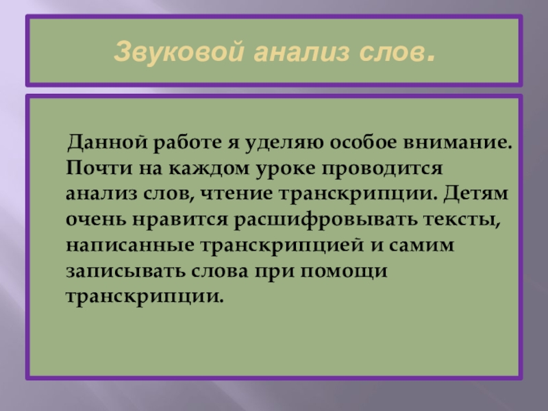 Почти на каждом уроке проводится анализ слов, чтение транскрипции. Детям очень нравится расшифровывать тексты, написанные транскрипцией и самим записывать слова при помощи транскрипции.