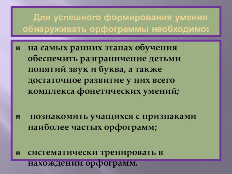 Для успешного формирования умения обнаруживать орфограммы необходимо: