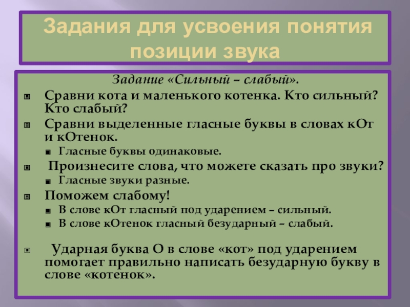Сравни выделенные гласные буквы в словах кОт и кОтенок.