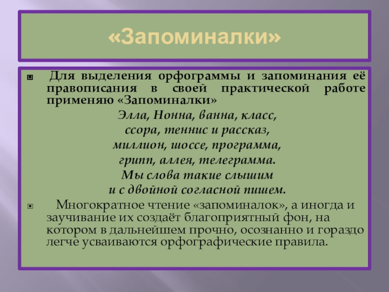 Многократное чтение «запоминалок», а иногда и заучивание их создаёт благоприятный фон, на котором в дальнейшем прочно, осознанно и гораздо легче усваиваются орфографические правила.