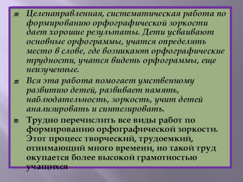 Слайд 16Целенаправленная, систематическая работа по формированию орфографической зоркости дает хорошие результаты. Дети