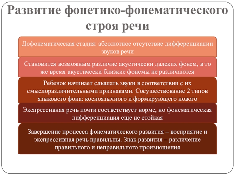 Завершение процесса фонематического развития – восприятие и экспрессивная речь правильны. Знак развития – различение правильного и неправильного произношения