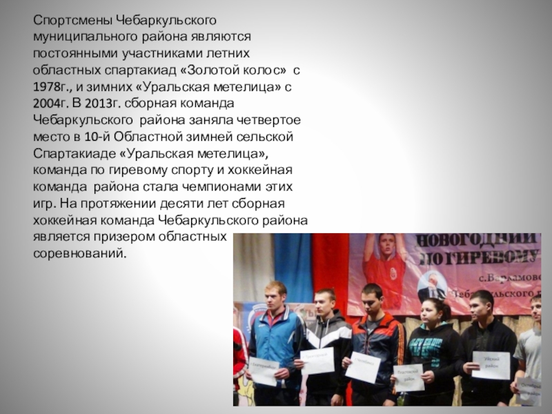 колос» с 1978г., и зимних «Уральская метелица» с 2004г. В 2013г. сборная команда Чебаркульского района заняла четвертое место в 10-й Областной зимней сельской Спартакиаде «Уральская метелица», команда по гиревому спорту и хоккейная команда района стала чемпионами этих игр. На протяжении десяти лет сборная хоккейная команда Чебаркульского района является призером областных соревнований.
