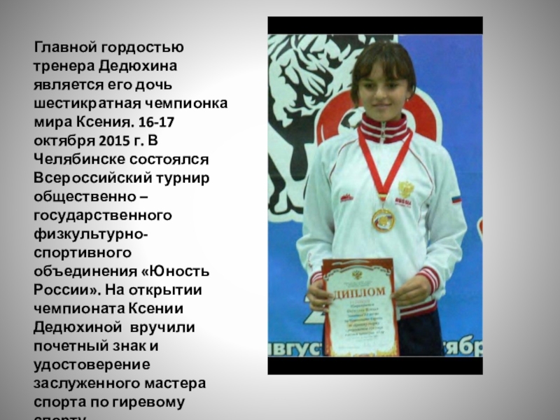 Слайд 10Главной гордостью тренера Дедюхина является его дочь шестикратная чемпионка мира Ксения.