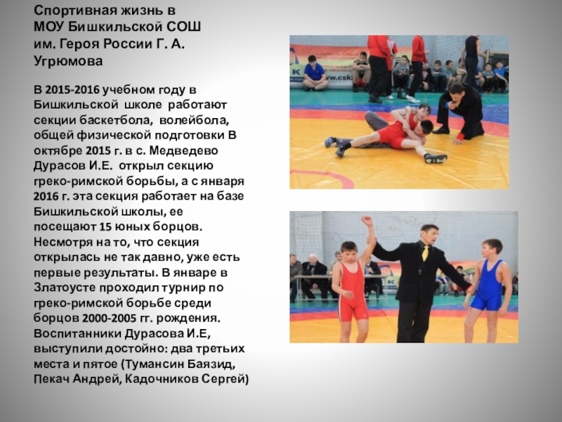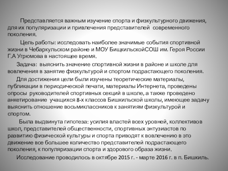 Цель работы: исследовать наиболее значимые события спортивной жизни в Чебаркульском районе и МОУ БищкильскойСОШ им. Героя России Г.А Угрюмова в настоящее время.