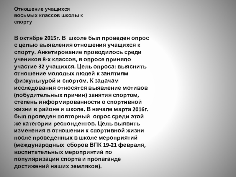 был проведен опрос с целью выявления отношения учащихся к спорту. Анкетирование проводилось среди учеников 8-х классов, в опросе приняло участие 32 учащихся. Цель опроса: выяснить отношение молодых людей к занятиям физкультурой и спортом. К задачам исследования относятся выявление мотивов (побудительных причин) занятия спортом, степень информированности о спортивной жизни в районе и школе. В начале марта 2016г. был проведен повторный опрос среди этой же категории респондентов. Цель выявить изменения в отношении к спортивной жизни после проведенных в школе мероприятий (международных сборов ВПК 19-21 февраля, воспитательных мероприятий по популяризации спорта и пропаганде достижений наших земляков).