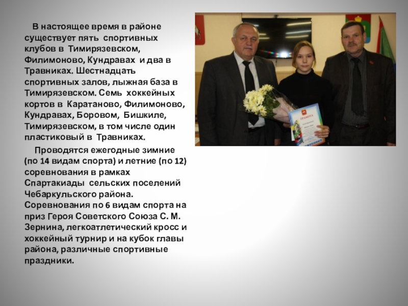 Слайд 6 В настоящее время в районе существует пять спортивных клубов