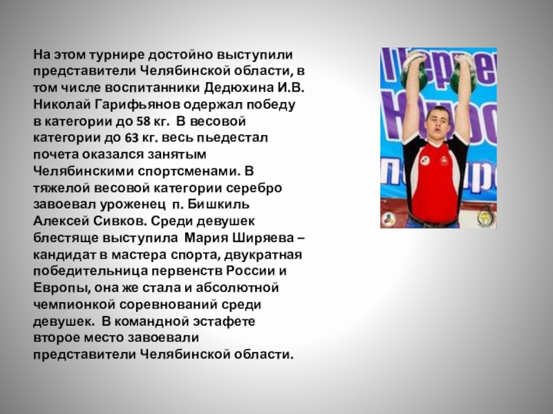 воспитанники Дедюхина И.В. Николай Гарифьянов одержал победу в категории до 58 кг. В весовой категории до 63 кг. весь пьедестал почета оказался занятым Челябинскими спортсменами. В тяжелой весовой категории серебро завоевал уроженец п. Бишкиль Алексей Сивков. Среди девушек блестяще выступила Мария Ширяева – кандидат в мастера спорта, двукратная победительница первенств России и Европы, она же стала и абсолютной чемпионкой соревнований среди девушек. В командной эстафете второе место завоевали представители Челябинской области.