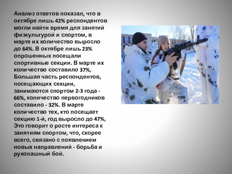 время для занятий физкультурой и спортом, в марте их количество выросло до 64%. В октябре лишь 23% опрошенных посещали спортивные секции. В марте их количество составило 37%, Большая часть респондентов, посещающих секции, занимаются спортом 2-3 года - 66%, количество первогодников составило - 32%. В марте количество тех, кто посещает секцию 1-й, год выросло до 47%, Это говорит о росте интереса к занятиям спортом, что, скорее всего, связано с появлением новых направлений - борьба и рукопашный бой.