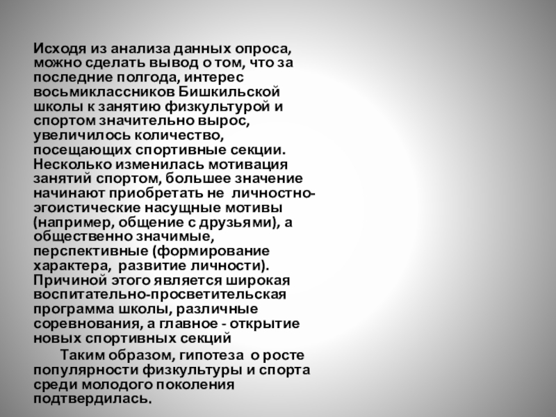 за последние полгода, интерес восьмиклассников Бишкильской школы к занятию физкультурой и спортом значительно вырос, увеличилось количество, посещающих спортивные секции. Несколько изменилась мотивация занятий спортом, большее значение начинают приобретать не личностно-эгоистические насущные мотивы (например, общение с друзьями), а общественно значимые, перспективные (формирование характера, развитие личности). Причиной этого является широкая воспитательно-просветительская программа школы, различные соревнования, а главное - открытие новых спортивных секций