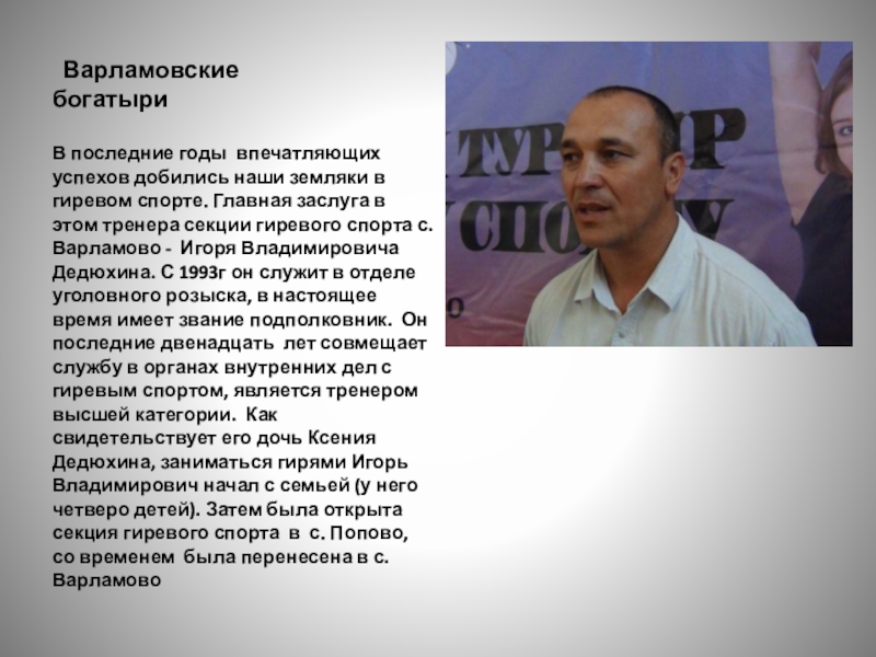 гиревом спорте. Главная заслуга в этом тренера секции гиревого спорта с. Варламово - Игоря Владимировича Дедюхина. С 1993г он служит в отделе уголовного розыска, в настоящее время имеет звание подполковник. Он последние двенадцать лет совмещает службу в органах внутренних дел с гиревым спортом, является тренером высшей категории. Как свидетельствует его дочь Ксения Дедюхина, заниматься гирями Игорь Владимирович начал с семьей (у него четверо детей). Затем была открыта секция гиревого спорта в с. Попово, со временем была перенесена в с. Варламово