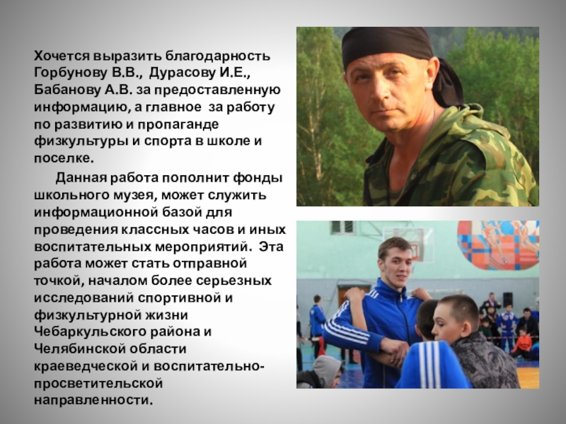 Слайд 19Хочется выразить благодарность Горбунову В.В., Дурасову И.Е., Бабанову А.В. за предоставленную