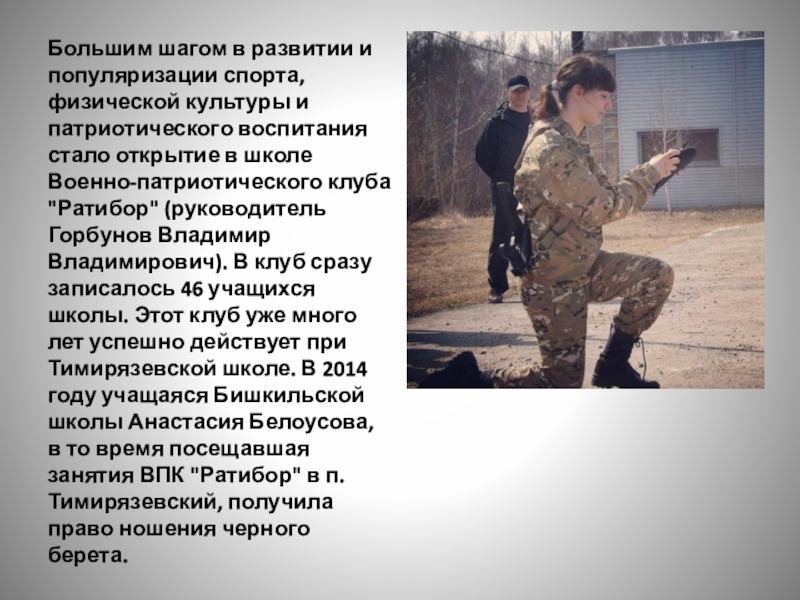 воспитания стало открытие в школе Военно-патриотического клуба "Ратибор" (руководитель Горбунов Владимир Владимирович). В клуб сразу записалось 46 учащихся школы. Этот клуб уже много лет успешно действует при Тимирязевской школе. В 2014 году учащаяся Бишкильской школы Анастасия Белоусова, в то время посещавшая занятия ВПК "Ратибор" в п. Тимирязевский, получила право ношения черного берета.