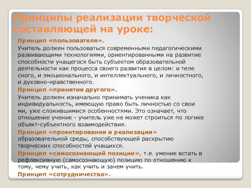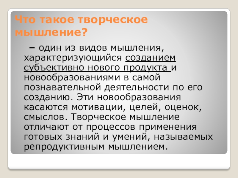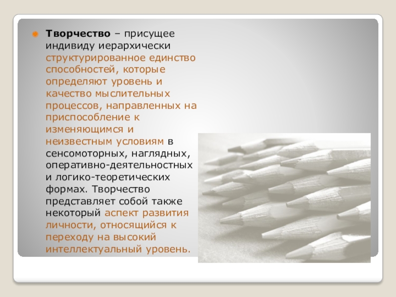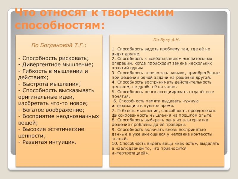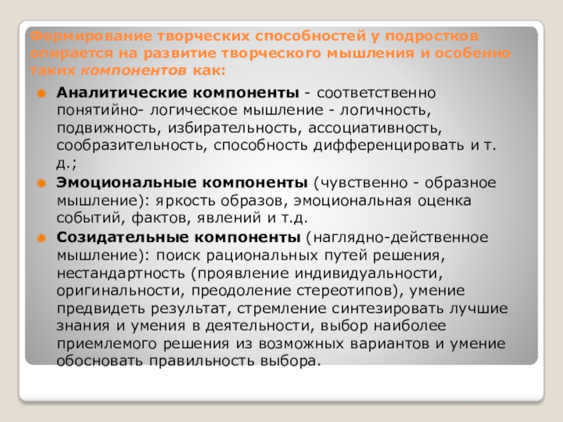 Созидательные компоненты (наглядно-действенное мышление): поиск рациональных путей решения, нестандартность (проявление индивидуальности, оригинальности, преодоление стереотипов), умение предвидеть результат, стремление синтезировать лучшие знания и умения в деятельности, выбор наиболее приемлемого решения из возможных вариантов и умение обосновать правильность выбора.