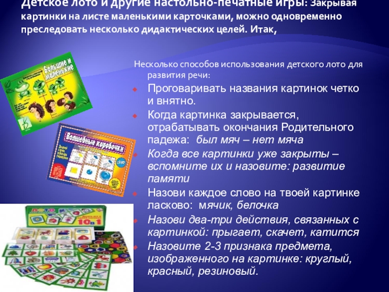 Детское лото и другие настольно-печатные игры: Закрывая картинки на листе маленькими карточками, можно одновременно преследовать несколько дидактических целей. Итак,