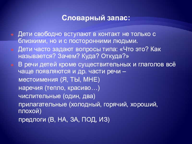 В речи детей кроме существительных и глаголов всё чаще появляются и др. части речи –