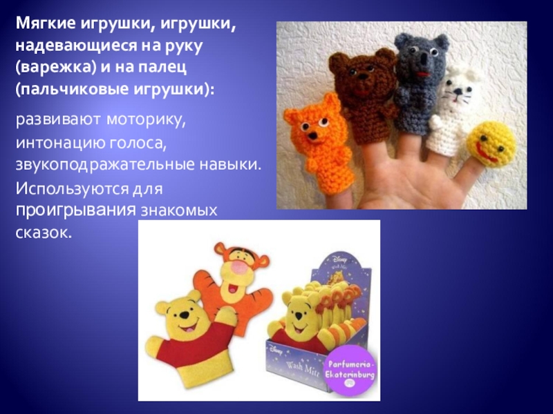 Мягкие игрушки, игрушки, надевающиеся на руку (варежка) и на палец (пальчиковые