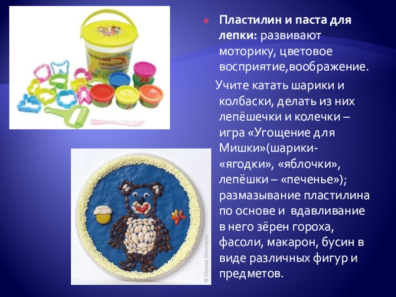 катать шарики и колбаски, делать из них лепёшечки и колечки – игра «Угощение для Мишки»(шарики- «ягодки», «яблочки», лепёшки – «печенье»); размазывание пластилина по основе и вдавливание в него зёрен гороха, фасоли, макарон, бусин в виде различных фигур и предметов.