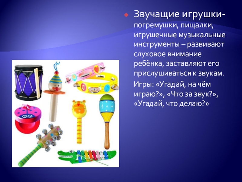 Слайд 14Звучащие игрушки- погремушки, пищалки, игрушечные музыкальные инструменты – развивают слуховое внимание