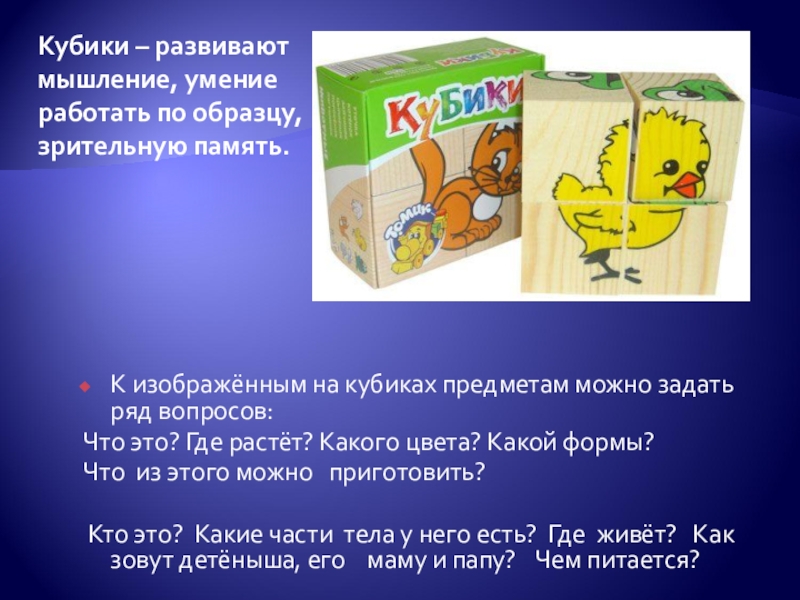 Слайд 10Кубики – развивают мышление, умение работать по образцу, зрительную память.