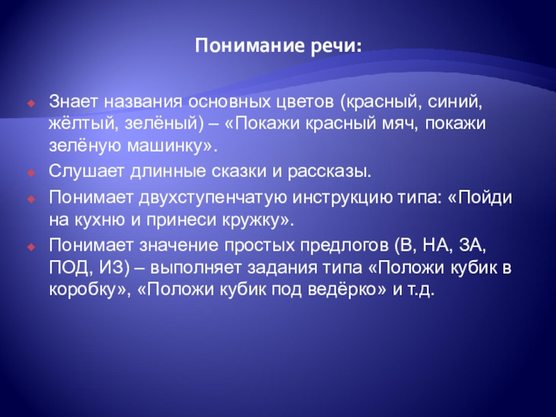 Понимает значение простых предлогов (В, НА, ЗА, ПОД, ИЗ) – выполняет задания типа «Положи кубик в коробку», «Положи кубик под ведёрко» и т.д.